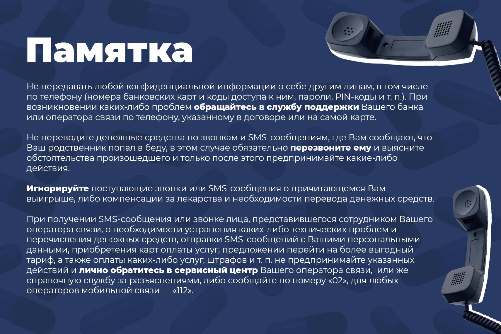 Далее в инфографике — простые и понятные рекомендации, которые помогут избежать распространённых угроз и действовать грамотно при попытках обмана.